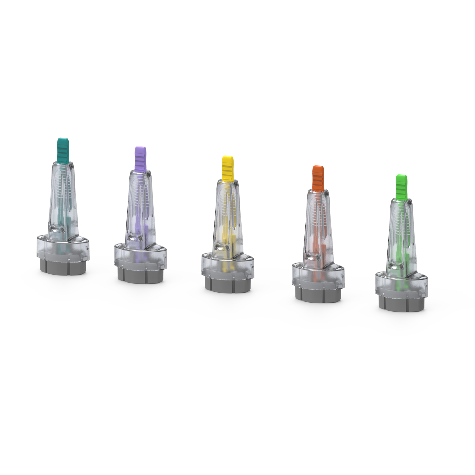 筒形采血筆OneStep型一步裝針,無需卸帽。 筒形采血筆OneStep型專配SoftSense型采血針,不通配市面上其他款式采血針。